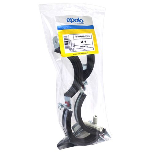 Abrazadera APOLO reforzada isofónica M8+M10, con soldadura en cruz y tornillo alomado impronta pz+ranura más largos. Diseño con doble refuerzo, goma de EPDM más gruesa y mayor parte roscada en el perfil para garantizar un mejor agarre.