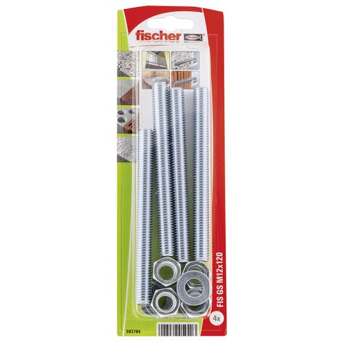 La varilla roscada inyección FIS GS de fischer se fabrica en acero electrogalvanizado de la calidad de acero 5.8. El anclaje de rosca es un accesorio de sistema para el adaptador de inyección FIS de fischer. En el montaje con los morteros de inyección, la varilla roscada se introduce a mano en la perforación mediante ligeros movimientos giratorios. El sistema es especialmente adecuado para la fijación económica de máquinas, estructuras de acero y patas de apoyo en interiores.