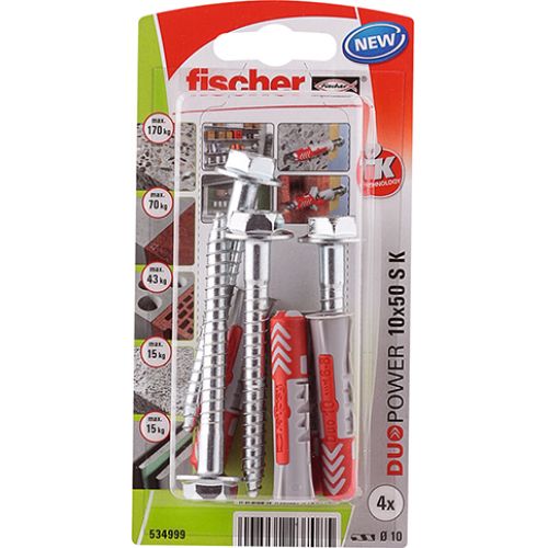 El DUOPOWER de fischer ofrece unos valores de sujeción muy buenos gracias a los 2 componentes: el componente gris de Nylon de gran calidad activa automáticamente, dependiendo del material de construcción, el principio de funcionamiento óptimo (expansión, bloqueo, nudo) para una mejor sujeción. El ala de expansión de los componentes rojos refuerza la expansión segura y ofrecen una seguridad adicional a los componentes grises. Giro sencillo del tornillo y «extracción» correcta al final. El tornillo no gira en exceso. El borde incorporado en la cabeza del taco impide que éste se hunda en la perforación.