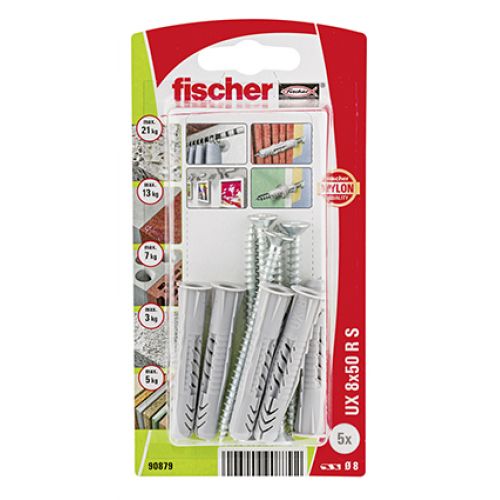 La fijación universal UX de Fischer es un taco multi-material fabricado con nylon de alta calidad. El UX funciona formando un nudo en materiales como por ejemplo cartón laminado o yeso. En ladrillo utiliza la adaptación como modo de anclaje y en materiales macizos se adhiere por expansión. El reborde integrado tiene un objetivo práctico: impide que el taco se meta por completo dentro del orificio del taladro durante la inserción. Los tornillos de la medida y diámetro correctos van incluidos en el embalaje; la cual cosa nos ahorra tiempo y garantiza que encajen perfectamente en el agujero. Se puede usar para fijar por ejemplo: lámparas, barras de cortinas, armarios y cornisas.