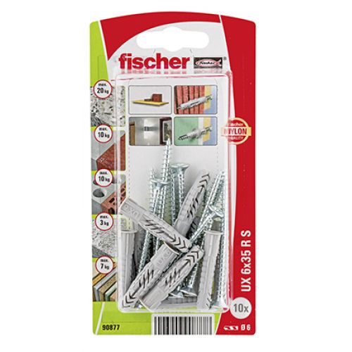 La fijación universal UX de Fischer es un taco multi-material fabricado con nylon de alta calidad. El UX funciona formando un nudo en materiales como por ejemplo cartón laminado o yeso. En ladrillo utiliza la adaptación como modo de anclaje y en materiales macizos se adhiere por expansión. El reborde integrado tiene un objetivo práctico: impide que el taco se meta por completo dentro del orificio del taladro durante la inserción. Los tornillos de la medida y diámetro correctos van incluidos en el embalaje; la cual cosa nos ahorra tiempo y garantiza que encajen perfectamente en el agujero. Se puede usar para fijar por ejemplo: lámparas, barras de cortinas, armarios y cornisas.