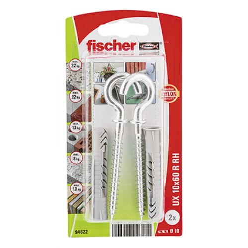 La fijación universal UX de Fischer es un taco multi-material fabricado con nylon de alta calidad. El UX funciona formando un nudo en materiales como por ejemplo cartón laminado o yeso. En ladrillo utiliza la adaptación como modo de anclaje y en materiales macizos se adhiere por expansión. El reborde integrado tiene un objetivo práctico: impide que el taco se meta por completo dentro del orificio del taladro durante la inserción. Las hembrillas abiertas van incluidas en el embalaje; la cual cosa nos ahorra tiempo y garantiza que encajen perfectamente en el agujero. Se puede usar para fijar por ejemplo: lámparas y objetos suspendidos.