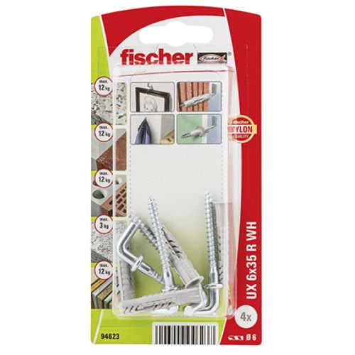 La fijación universal UX de Fischer es un taco multi-material fabricado con nylon de alta calidad. El UX funciona formando un nudo en materiales como por ejemplo cartón laminado o yeso. En ladrillo utiliza la adaptación como modo de anclaje y en materiales macizos se adhiere por expansión. El reborde integrado tiene un objetivo práctico: impide que el taco se meta por completo dentro del orificio del taladro durante la inserción. Las alcayatas van incluidas en el embalaje; la cual cosa nos ahorra tiempo y garantiza que encajen perfectamente en el agujero. Se puede usar para colgar por ejemplo: cuadros, estanterías y armarios de pared.