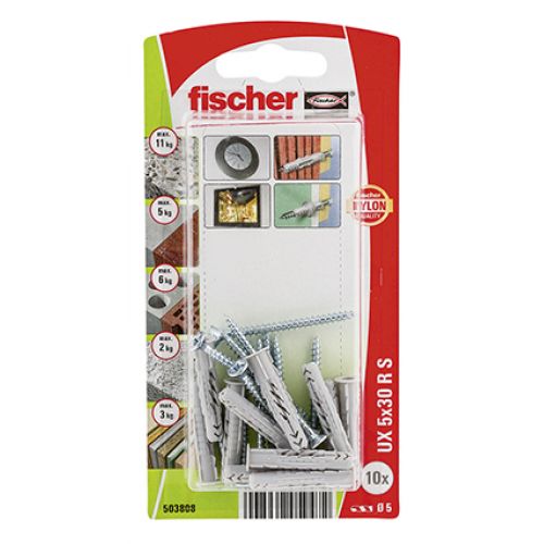 La fijación universal UX de Fischer es un taco multi-material fabricado con nylon de alta calidad. El UX funciona formando un nudo en materiales como por ejemplo cartón laminado o yeso. En ladrillo utiliza la adaptación como modo de anclaje y en materiales macizos se adhiere por expansión. El reborde integrado tiene un objetivo práctico: impide que el taco se meta por completo dentro del orificio del taladro durante la inserción. Los tornillos de la medida y diámetro correctos van incluidos en el embalaje; la cual cosa nos ahorra tiempo y garantiza que encajen perfectamente en el agujero. Se puede usar para fijar por ejemplo: lámparas, barras de cortinas, armarios y cornisas.
