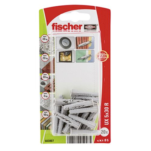 La fijación universal UX de Fischer es un taco multi-material fabricado con nylon de alta calidad. El UX funciona formando un nudo en materiales como por ejemplo cartón laminado o yeso. En ladrillo utiliza la adaptación como modo de anclaje y en materiales macizos se adhiere por expansión. El reborde integrado cumple un objetivo práctico: impide que el taco se introduzca completamente en el orificio del taladro durante la inserción. Puede usarse para fijar, por ejemplo: lámparas, barras de cortinas, armarios ligeros y cornisas.