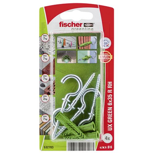 Taco universal fischer UX GREEN 6 x 35 RH con reborde y hembrilla abierta
