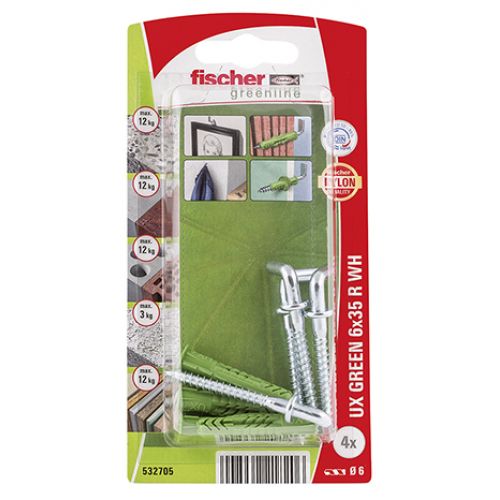 Taco universal fischer UX GREEN 6 x 35 R WH con reborde y alcayata SB-card