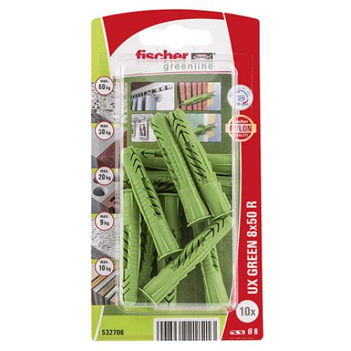El taco universal UX GREEN de fischer es una fijación de plástico de Nylon de gran calidad. El granulado para la fabricación del taco se compone al menos en la mitad de materias primas renovables. Estas no compiten con áreas de cultivo para la producción de alimentos y forrajes. El UX GREEN cuenta con las mismas características de rendimiento y capacidad de carga que el original gris. El taco universal de fischer se expande en los materiales macizos y se anuda en los materiales huecos y en las placas para una sujeción máxima. De este modo, el UX de fischer es siempre la elección correcta: incluso en materiales de construcción desconocidos. El borde impide que se hunda durante el montaje. En la versión con borde, el taco universal UX GREEN de fischer es adecuado para el premontaje. El taco universal UX GREEN de fischer es, por ejemplo, recomendable para la fijación de luces, rieles para cortinas, armarios ligeros y listones de zócalo.