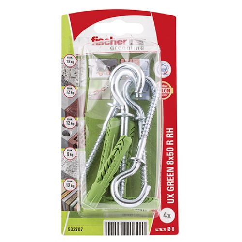 Taco universal fischer UX GREEN 8 x 50 R RH con reborde y hembrilla abierta SB-card