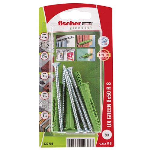 El taco universal UX GREEN de fischer es una fijación de plástico de Nylon de gran calidad. El granulado para la fabricación del taco se compone al menos en la mitad de materias primas renovables. Estas no compiten con áreas de cultivo para la producción de alimentos y forrajes. El UX GREEN cuenta con las mismas características de rendimiento y capacidad de carga que el original gris. El taco universal de fischer se expande en los materiales macizos y se anuda en los materiales huecos y en las placas para una sujeción máxima. De este modo, el UX de fischer es siempre la elección correcta: incluso en materiales de construcción desconocidos. El borde impide que se hunda durante el montaje. En la versión con borde, el taco universal UX GREEN de fischer es adecuado para el premontaje. El taco universal UX GREEN de fischer es, por ejemplo, recomendable para la fijación de luces, rieles para cortinas, armarios ligeros y listones de zócalo.