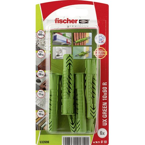 El taco universal UX GREEN de fischer es una fijación de plástico de Nylon de gran calidad. El granulado para la fabricación del taco se compone al menos en la mitad de materias primas renovables. Estas no compiten con áreas de cultivo para la producción de alimentos y forrajes. El UX GREEN cuenta con las mismas características de rendimiento y capacidad de carga que el original gris. El taco universal de fischer se expande en los materiales macizos y se anuda en los materiales huecos y en las placas para una sujeción máxima. De este modo, el UX de fischer es siempre la elección correcta: incluso en materiales de construcción desconocidos. El borde impide que se hunda durante el montaje. En la versión con borde, el taco universal UX GREEN de fischer es adecuado para el premontaje. El taco universal UX GREEN de fischer es, por ejemplo, recomendable para la fijación de luces, rieles para cortinas, armarios ligeros y listones de zócalo.