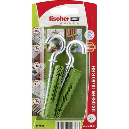 Taco universal fischer UX GREEN 10 x 60 RH con reborde y hembrilla abierta SB-card