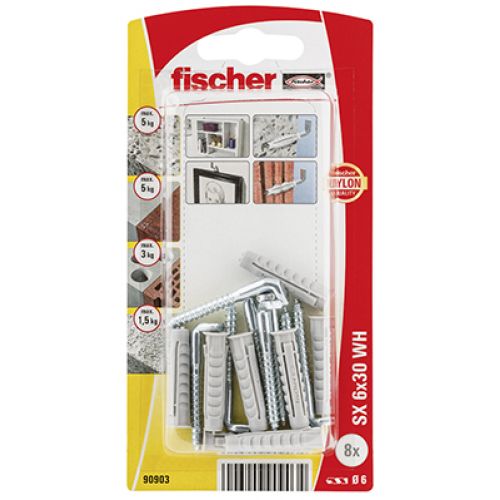 Debido a la expansión por sus 4 costados, la fijación por expansión SX de Fischer transfiere de manera óptima las fuerzas al material de construcción. El nylon de alta calidad usado en su producción y su expansión típica garantizan una conexión segura y permanente. El reborde en la cabeza de la fijación evita que el taco se cuele dentro del orificio del taladro. Las alcayatas suministradas encajan a la perfección con la fijación SX y garantizan una fijación perfecta.