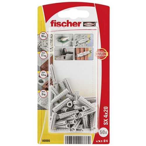 Debido a la expansión por sus 4 costados, la fijación por expansión SX de Fischer transfiere de manera óptima las fuerzas al material de construcción. El nylon de alta calidad usado en su producción y su expansión típica garantizan una conexión segura y permanente. El reborde en la cabeza de la fijación evita que el taco se cuele dentro del orificio del taladro.El taco de expansión SX es la mejor opción para fijar lámparas, instalaciones de baños, armarios ligeros.