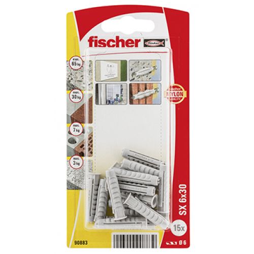 Debido a la expansión por sus 4 costados, la fijación por expansión SX de Fischer transfiere de manera óptima las fuerzas al material de construcción. El nylon de alta calidad usado en su producción y su expansión típica garantizan una conexión segura y permanente. El reborde en la cabeza de la fijación evita que el taco se cuele dentro del orificio del taladro.El taco de expansión SX es la mejor opción para fijar lámparas, instalaciones de baños, armarios ligeros.