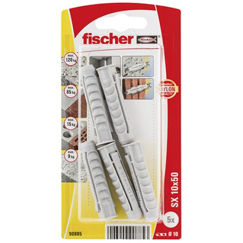 Debido a la expansión por sus 4 costados, la fijación por expansión SX de Fischer transfiere de manera óptima las fuerzas al material de construcción. El nylon de alta calidad usado en su producción y su expansión típica garantizan una conexión segura y permanente. El reborde en la cabeza de la fijación evita que el taco se cuele dentro del orificio del taladro.El taco de expansión SX es la mejor opción para fijar lámparas, instalaciones de baños, armarios ligeros.