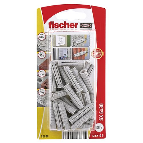 Debido a la expansión por sus 4 costados, la fijación por expansión SX de Fischer transfiere de manera óptima las fuerzas al material de construcción. El nylon de alta calidad usado en su producción y su expansión típica garantizan una conexión segura y permanente. El reborde en la cabeza de la fijación evita que el taco se cuele dentro del orificio del taladro.El taco de expansión SX es la mejor opción para fijar lámparas, instalaciones de baños, armarios ligeros.