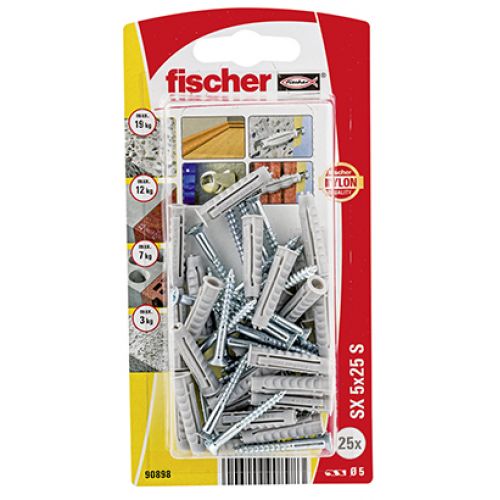 Debido a la expansión por sus 4 costados, la fijación por expansión SX de Fischer transfiere de manera óptima las fuerzas al material de construcción. El nylon de alta calidad usado en su producción y su expansión típica garantizan una conexión segura y permanente. El reborde en la cabeza de la fijación evita que el taco se cuele dentro del orificio del taladro. Los tornillos suministrados con el SX son de la medida ideal para garantizar una expansión óptima. Se puede fijar por ejemplo: lámparas, instalaciones de baños, armarios ligeros.