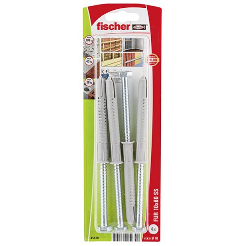La fijación de marco FUR-SS de fischer compone de un manguito de taco de Nylon de gran calidad y un tornillo de cabeza hexagonal de acero electrogalvanizado. La FUR-SS se utiliza en el montaje pasante rápido. Al girar el tornillo, las laminillas se expanden de forma uniforme en el material macizo contra la pared de la perforación. En materiales perforados, las laminillas se expanden en el refuerzo de piedra, creando un rebaje en el hueco. De este modo, la fijación de marco FUR de fischer es adecuado para fijar de forma segura maderas escuadradas, portones y puertas en todos los materiales de construcción.