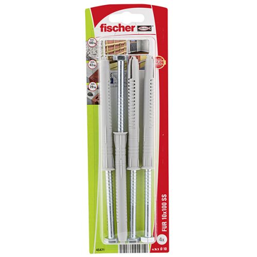 La fijación de marco FUR-SS de fischer compone de un manguito de taco de Nylon de gran calidad y un tornillo de cabeza hexagonal de acero electrogalvanizado. La FUR-SS se utiliza en el montaje pasante rápido. Al girar el tornillo, las laminillas se expanden de forma uniforme en el material macizo contra la pared de la perforación. En materiales perforados, las laminillas se expanden en el refuerzo de piedra, creando un rebaje en el hueco. De este modo, la fijación de marco FUR de fischer es adecuado para fijar de forma segura maderas escuadradas, portones y puertas en todos los materiales de construcción.