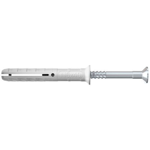 El Hammerfix N-S de fischer con cabeza avellanada se compone de un taco de Nylon de gran calidad y un tornillo clavo electrogalvanizado. Ya están montados para un montaje rápido. El taco de golpe se introduce a través del componente en el montaje pasante rápido. Al golpear el tornillo clavo, el manguito del taco se expande y se ancla de forma segura al componente. El Hammerfix N-S de fischer con cabeza avellanada es ideal para la fijación de estructuras de madera en todos los componentes en interiores.