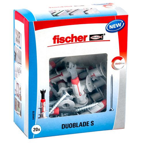 El fischer DUOBLADE es el miembro más joven de la innovadora família DUO-line. Contiene diferentes componentes que permiten obtener el mejor rendimiento. La punta autoperforante permite un proceso de perforación limpio y eficaz. La fijación se atornilla en la instalación colocada previamente con el destornillador (inalámbrico) a ras de la superficie de la placa de yeso. El DUOBLADE de fischer es adecuado para tornillos para madera, metal y aglomerado de 4 a 5 mm de grosor, así como para diferentes ganchos y tornillos de argolla. Por lo tanto, es apropiado para fijar, por ejemplo, detectores de humo, barras de cortina y persianas, de forma rápida y segura.