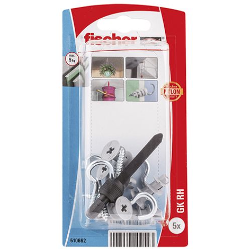 La fijación de paneles de yeso GK RH de fischer está fabricada en Nylon de gran calidad. El taco se atornilla en el premontaje con la herramienta de inserción incluida con un atornillador a batería enrasado en el panel de pladur. En las placas de hasta 15 mm de grosor no es necesario el pretaladrado. El GK RH de fischer se suministra completamente con ganchos redondos. De este modo, es ideal para fijar de forma rápida y segura cuadros, luces e instalaciones eléctricas.
