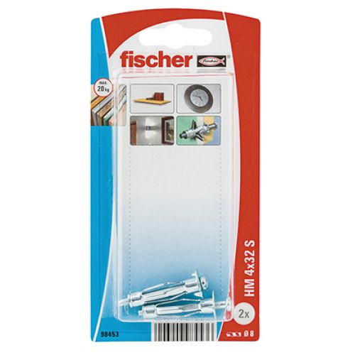 El anclaje metálico para cavidades huecas HM-S de Fischer es una fijación versatil con un tornillo de rosca métrica para todo tipo de contrucciones con paneles. La fijación se coloca mediante las pinzas de expansión HM-Z 1. Con estas pinzas conseguimos estirar de la fijación hacia afuera y contra el tablero. En este caso, los brazos metálicos del taco HM-M se expanden y presionan la placa de yeso por dentro, quedándose fuertemente sujeto. También podemos armarlo manualmente mediante un destornillador. El anclaje metálico HM-S sirve para colocar luces, colgadores de toallas o soportes para cortinas.