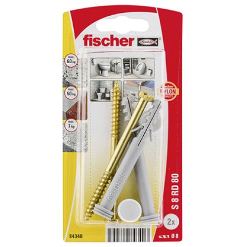 El juego de fijación WC S 8 RD 80 K de fischer incluye todos los elementos para la fijación segura de inodoros de suelo: 2 tacos de expansión 8 RD 60 de fischer de Nylon de gran calidad, 2 tornillos de latón para madera 6 x 85 con cabeza hexagonal y 2 tapas cromada o en blanco respectivamente.