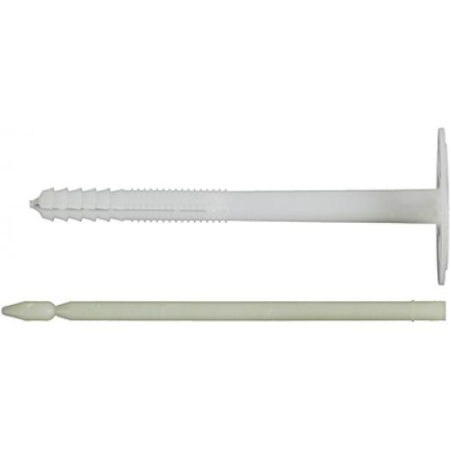 La fijación de revoque DIPK 10 de fischer se compone de un manguito del taco blanco con placa incorporada y clavo de plástico reforzado con fibra de vidrio. La DIPK 10 se coloca golpeándolo con el martillo. Al clavar el clavo, el mango del taco se expande en el material de construcción. Al utilizar en materiales macizos, el clavo GFK debe recortarse por el punto de rotura predeterminado en forma de cono. La fijación de revoque DIPK 10 de fischer es ideal para fijar de forma segura materiales aislantes sin presión de hasta 160 mm de grosor como paneles de poliestireno, paneles de construcción ligera de virutas de madera y paneles de espuma dura de poliuretano en hormigón, ladrillo de hormigón macizo y piedra perforada.