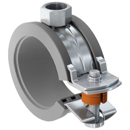 La abrazadera isofónica de plástico FKS Plus 59-63 de fischer para tamaños nominales de 2". El bloqueo rápido permite un montaje sencillo y rápido de tuberías. Los espaciadores en los tornillos de cierre garantizan dirigir las tuberías en caso de expansiones longitudinales. Tuerca de conexión con rosca M8 para incorporar varillas roscadas o pernos de sustentación. Tornillos para abrazaderas isofónicas con protección contra la pérdida.