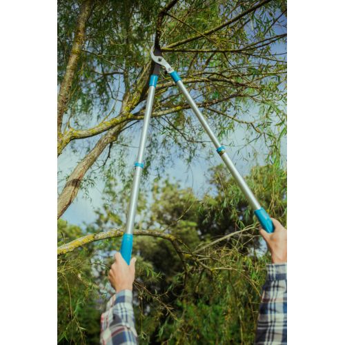 INFO: Tijeras de podar telescópicas de dos manos tipo bypass con cuchillas de acero al carbono, teflonadas para evitar la fricción y facilitar el corte.