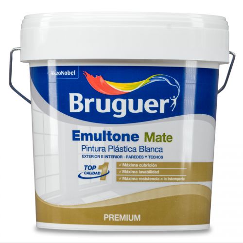 Bruguer Emultone Mate Blanco de la gama de Pinturas Plásticas exterior - interior de máxima calidad. Impermeable al agua de lluvia y transpirable al vapor de agua. Monocapa, sin olor y no salpica. Fácil de aplicar: cubrición total con una mano. Aplicación con brocha, rodillo o pistola y agua como disolvente. Secado al tacto 30min y espera al repintado de segunda mano 3h. Para pintar de 12-14 a m² de rendimiento con un acabado satinado perfecto. Pintura de máxima resistencia y lavabilidad probada con resistencia antimoho. El color permanece inalterable a lo largo del tiempo: no amarillea. La pintura plástica blanca es una pintura amigable con el medio ambiente y tu salud.