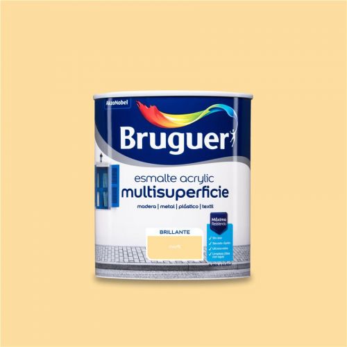 Bruguer Esmalte Acryllic Multisuperficie Brillante, es una pintura esmalte exterior o interior al agua para decorar y proteger toda clase de superficies de madera, hierro, yeso o cemento en exteriores o interiores. Ultralavable, sin olor. No amarillea, gran flexibilidad, gran adherencia y elasticidad. Su exclusiva fórmula al agua, Diamond Technology, proporciona un acabado de alta calidad, excelente resistencia y durabilidad. Fácil de aplicar: cubrición a una o tres manos, no salpica, listo al uso, se aplica con brocha, rodillo o pistola. Secado al tacto 30min, repintado 6 horas. Esmalte Brillante es ideal para decorar y proteger toda clase de superficies.