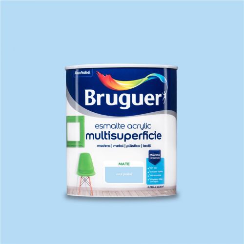 Deja volar tu imaginación con los Esmalte Acryllic Multisuperficie y pinta todo tipo de superficies de madera, metal, plástico y textil. Ahora pintar, será más divertido. Bruguer Esmalte Acryllic MultisuperficieMate, es una pintura esmalte exterior o interior al agua para decorar y proteger toda clase de superficies de madera, hierro, yeso o cemento en exteriores o interiores. Ultralavable, sin olor. No amarillea, gran flexibilidad, gran adherencia y elasticidad. Su exclusiva fórmula al agua, Diamond Technology, proporciona un acabado de alta calidad, excelente resistencia y durabilidad. Fácil de aplicar: cubrición a una o tres manos, no salpica, listo al uso, se aplica con brocha, rodillo o pistola. Secado al tacto 30min, repintado 6 horas. Esmalte Mate es ideal para decorar y proteger toda clase de superficies.