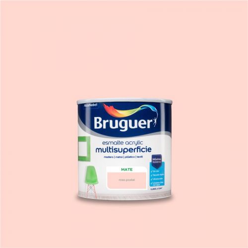 Bruguer Esmalte Acryllic Multisuperficie Mate, es una pintura esmalte exterior o interior al agua para decorar y proteger toda clase de superficies de madera, hierro, yeso o cemento en exteriores o interiores. Ultralavable, sin olor. No amarillea, gran flexibilidad, gran adherencia y elasticidad. Su exclusiva fórmula al agua, Diamond Technology, proporciona un acabado de alta calidad, excelente resistencia y durabilidad. Fácil de aplicar: cubrición a una o tres manos, no salpica, listo al uso, se aplica con brocha, rodillo o pistola. Secado al tacto 30min, repintado 6 horas. Esmalte Mate es ideal para decorar y proteger toda clase de superficies.