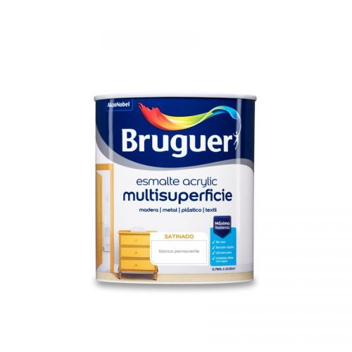 Bruguer Esmalte Acryllic Multisuperficie Satinado, es una pintura esmalte exterior o interior al agua para decorar y proteger toda clase de superficies de madera, hierro, yeso o cemento en exteriores o interiores. Ultralavable, sin olor. No amarillea, gran flexibilidad, gran adherencia y elasticidad. Su exclusiva fórmula al agua, Diamond Technology, proporciona un acabado de alta calidad, excelente resistencia y durabilidad. Fácil de aplicar: cubrición a una o tres manos, no salpica, listo al uso, se aplica con brocha, rodillo o pistola. Secado al tacto 30min, repintado 6 horas. Esmalte Satinado es ideal para decorar y proteger toda clase de superficies.