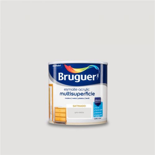 Bruguer Esmalte Acryllic Multisuperficie Satinado, es una pintura esmalte exterior o interior al agua para decorar y proteger toda clase de superficies de madera, hierro, yeso o cemento en exteriores o interiores. Ultralavable, sin olor. No amarillea, gran flexibilidad, gran adherencia y elasticidad. Su exclusiva fórmula al agua, Diamond Technology, proporciona un acabado de alta calidad, excelente resistencia y durabilidad. Fácil de aplicar: cubrición a una o tres manos, no salpica, listo al uso, se aplica con brocha, rodillo o pistola. Secado al tacto 30min, repintado 6 horas. Esmalte Satinado es ideal para decorar y proteger toda clase de superficies.