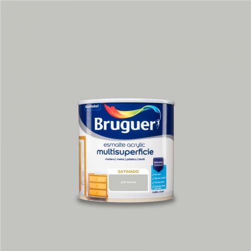 Bruguer Esmalte Acryllic Multisuperficie Satinado, es una pintura esmalte exterior o interior al agua para decorar y proteger toda clase de superficies de madera, hierro, yeso o cemento en exteriores o interiores. Ultralavable, sin olor. No amarillea, gran flexibilidad, gran adherencia y elasticidad. Su exclusiva fórmula al agua, Diamond Technology, proporciona un acabado de alta calidad, excelente resistencia y durabilidad. Fácil de aplicar: cubrición a una o tres manos, no salpica, listo al uso, se aplica con brocha, rodillo o pistola. Secado al tacto 30min, repintado 6 horas. Esmalte Satinado es ideal para decorar y proteger toda clase de superficies.
