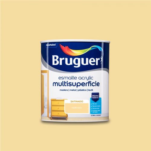 Bruguer Esmalte Acryllic Multisuperficie Satinado, es una pintura esmalte exterior o interior al agua para decorar y proteger toda clase de superficies de madera, hierro, yeso o cemento en exteriores o interiores. Ultralavable, sin olor. No amarillea, gran flexibilidad, gran adherencia y elasticidad. Su exclusiva fórmula al agua, Diamond Technology, proporciona un acabado de alta calidad, excelente resistencia y durabilidad. Fácil de aplicar: cubrición a una o tres manos, no salpica, listo al uso, se aplica con brocha, rodillo o pistola. Secado al tacto 30min, repintado 6 horas. Esmalte Satinado es ideal para decorar y proteger toda clase de superficies.