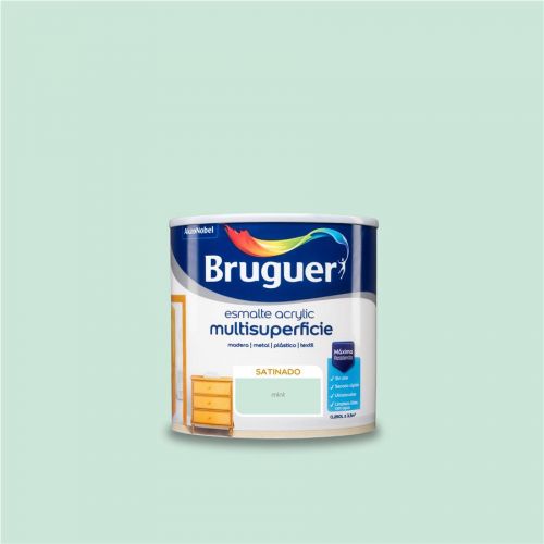 Bruguer Esmalte Acryllic Multisuperficie Satinado, es una pintura esmalte exterior o interior al agua para decorar y proteger toda clase de superficies de madera, hierro, yeso o cemento en exteriores o interiores. Ultralavable, sin olor. No amarillea, gran flexibilidad, gran adherencia y elasticidad. Su exclusiva fórmula al agua, Diamond Technology, proporciona un acabado de alta calidad, excelente resistencia y durabilidad. Fácil de aplicar: cubrición a una o tres manos, no salpica, listo al uso, se aplica con brocha, rodillo o pistola. Secado al tacto 30min, repintado 6 horas. Esmalte Satinado es ideal para decorar y proteger toda clase de superficies.