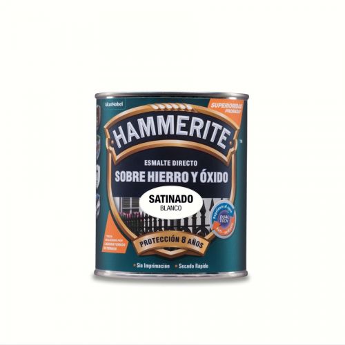 Hammerite acabado Liso Satinado es un esmalte antioxidante que se aplica directamente sobre hierro y oxido, indicado para la protección del metal de la corrosión y el óxido. Antioxidante recomendado para todo tipo de superficies de hierro y acero en exterior. Su exclusiva tecnología Dual Tech, impide la entrada de la humedad y bloquea el proceso de oxidación. Su fórmula 3 en 1, actúa como imprimación, fondo protector y acabado decorativo en un solo producto. La garantía de Hammerite es de 8 años de protección óptima contra la corrosión y el óxido. Ideal para muebles, rejas, barandillas y otros objetos de hierro ubicados en el exterior. Secado al tacto 1h, repintado 4h.