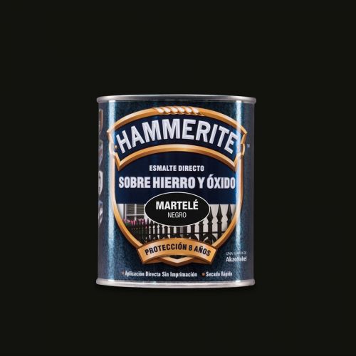 Hammerite acabado Martelé es un esmalte antioxidante que se aplica directamente sobre hierro y oxido, indicado para la protección del metal de la corrosión y el óxido. Antioxidante recomendado para todo tipo de superficies de hierro y acero en exterior. Su exclusiva tecnología Dual Tech, impide la entrada de la humedad y bloquea el proceso de oxidación. Su fórmula 3 en 1, actúa como imprimación, fondo protector y acabado decorativo en un solo producto. La garantía de Hammerite es de 8 años de protección óptima contra la corrosión y el óxido. Ideal para muebles, rejas, barandillas y otros objetos de hierro ubicados en el exterior. Secado al tacto 1h, repintado 4h