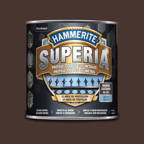 El metal se deteriora, especialmente en el exterior. Es particularmente vulnerable a la oxidación y precisa de productos específicos para protegerlo de manera duradera. Con Hammerite Superia Brillante Marrón Oscuro 2,5 L es la nueva generación en esmalte antioxidante al agua, formulado para aplicarse directo al óxido y sobre cualquier metal sin imprimación. Tiene una protección avanzada contra la corrosión de hasta 12 años en condiciones climáticas adversas y frente a la radiación UV. Con “colour lock technology”: brillo y color inalterable. Alta resistencia a golpes y ralladuras. Gracias a su acabado brillante, da un aspecto liso brillante a barandillas, rejas, verjas y todos los objetos de cualquier tipo de metal principalmente en exterior y expuestos a la intemperie y al sol. Excelente adherencia sobre hierro, hierro oxidado, acero, metal galvanizado, aluminio. Útiles de aplicación brocha, rodillo o pistola. Fácil aplicación en todos los metales, secado rápido, dos capas en un día. Tiempo de repintado 4 horas sin ningún límite, con pistola 1 hora entre capa y capa. Rendimiento de 7,5 m²/L por capa. El producto es base agua y ayuda a proteger el medio ambiente, además de brindar una fácil limpieza de útiles con agua y jabón. Listo para su uso. Disponibles en blanco, negro, gris, gris oscuro, marrón oscuro, rojo carruajes. No es recomendarle mezclar colores.