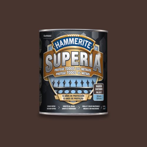 El metal se deteriora, especialmente en el exterior. Es particularmente vulnerable a la oxidación y precisa de productos específicos para protegerlo de manera duradera. Con Hammerite Superia Brillante Marrón Oscuro 750 mL es la nueva generación en esmalte antioxidante al agua, formulado para aplicarse directo al óxido y sobre cualquier metal sin imprimación. Tiene una protección avanzada contra la corrosión de hasta 12 años en condiciones climáticas adversas y frente a la radiación UV. Con “colour lock technology”: brillo y color inalterable. Alta resistencia a golpes y ralladuras. Gracias a su acabado brillante, da un aspecto liso brillante a barandillas, rejas, verjas y todos los objetos de cualquier tipo de metal principalmente en exterior y expuestos a la intemperie y al sol. Excelente adherencia sobre hierro, hierro oxidado, acero, metal galvanizado, aluminio. Útiles de aplicación brocha, rodillo o pistola. Fácil aplicación en todos los metales, secado rápido, dos capas en un día. Tiempo de repintado 4 horas sin ningún límite, con pistola 1 hora entre capa y capa. Rendimiento de 7,5 m²/L por capa. El producto es base agua y ayuda a proteger el medio ambiente, además de brindar una fácil limpieza de útiles con agua y jabón. Listo para su uso. Disponibles en blanco, negro, gris, gris oscuro, marrón oscuro, rojo carruajes. No es recomendarle mezclar colores.