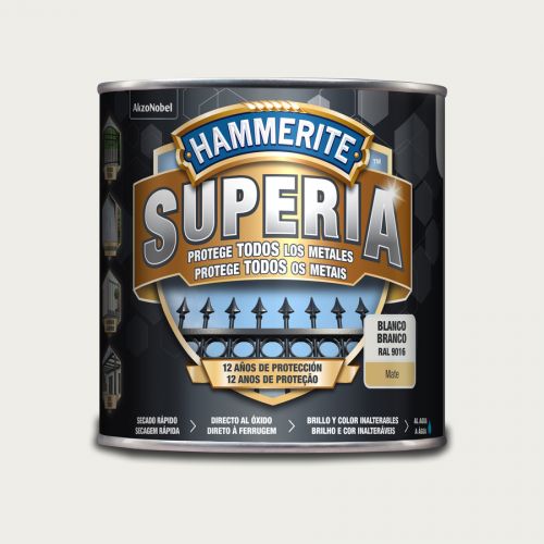 El metal se deteriora, especialmente en el exterior. Es particularmente vulnerable a la oxidación y precisa de productos específicos para protegerlo de manera duradera. Con Hammerite Superia Mate Blanco 2,5 L es la nueva generación en esmalte antioxidante al agua, formulado para aplicarse directo al óxido y sobre cualquier metal sin imprimación. Tiene una protección avanzada contra la corrosión de hasta 12 años en condiciones climáticas adversas y frente a la radiación UV. Con “colour lock technology”: mate y color inalterable. Alta resistencia a golpes y ralladuras. Gracias a su acabado mate, da un aspecto liso mate a barandillas, rejas, verjas y todos los objetos de cualquier tipo de metal principalmente en exterior y expuestos a la intemperie y al sol. Excelente adherencia sobre hierro, hierro oxidado, acero, metal galvanizado, aluminio. Útiles de aplicación brocha, rodillo o pistola. Fácil aplicación en todos los metales, secado rápido, dos capas en un día. Tiempo de repintado 4 horas sin ningún límite, con pistola 1 hora entre capa y capa. Rendimiento de 7,5 m²/L por capa. El producto es base agua y ayuda a proteger el medio ambiente, además de brindar una fácil limpieza de útiles con agua y jabón. Listo para su uso. Disponibles en blanco, negro, gris, gris oscuro, marrón oscuro, rojo carruajes. No es recomendarle mezclar colores.