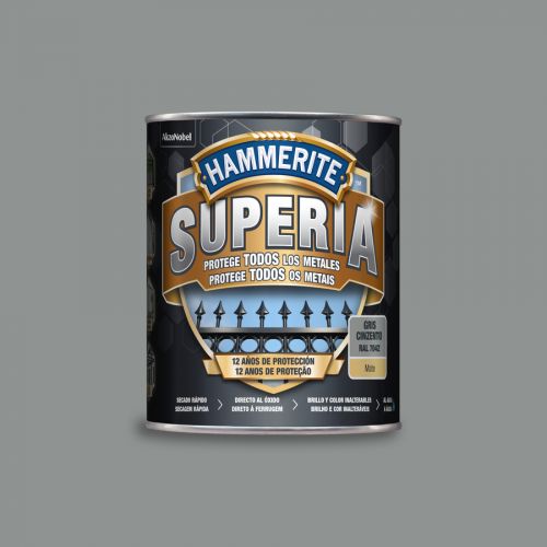 Hammerite Superia Mate Gris 750 mL es la nueva generación en esmalte antioxidante al agua, formulado para aplicarse directo al óxido y sobre cualquier metal sin imprimación. Tiene una protección avanzada contra la corrosión de hasta 12 años en condiciones climáticas adversas y frente a la radiación UV. Con “colour lock technology”: mate y color inalterable. Alta resistencia a golpes y ralladuras. Gracias a su acabado mate, da un aspecto liso brillante a mate, rejas, verjas y todos los objetos de cualquier tipo de metal principalmente en exterior y expuestos a la intemperie y al sol. Excelente adherencia sobre hierro, hierro oxidado, acero, metal galvanizado, aluminio. Útiles de aplicación brocha, rodillo o pistola. Fácil aplicación en todos los metales, secado rápido, dos capas en un día. Tiempo de repintado 4 horas sin ningún límite, con pistola 1 hora entre capa y capa. Rendimiento de 7,5 m²/L por capa. El producto es base agua y ayuda a proteger el medio ambiente, además de brindar una fácil limpieza de útiles con agua y jabón. Listo para su uso. Disponibles en blanco, negro, gris, gris oscuro, marrón oscuro, rojo carruajes. No es recomendarle mezclar colores.