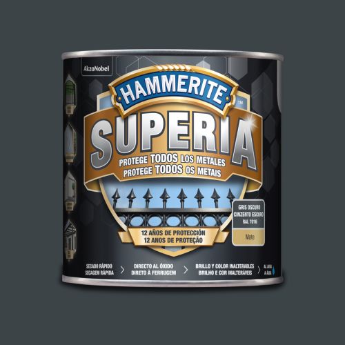 El metal se deteriora, especialmente en el exterior. Es particularmente vulnerable a la oxidación y precisa de productos específicos para protegerlo de manera duradera. Con Hammerite Superia Mate Gris Oscuro 2,5 L es la nueva generación en esmalte antioxidante al agua, formulado para aplicarse directo al óxido y sobre cualquier metal sin imprimación. Tiene una protección avanzada contra la corrosión de hasta 12 años en condiciones climáticas adversas y frente a la radiación UV. Con “colour lock technology”: mate y color inalterable. Alta resistencia a golpes y ralladuras. Gracias a su acabado mate, da un aspecto liso mate a barandillas, rejas, verjas y todos los objetos de cualquier tipo de metal principalmente en exterior y expuestos a la intemperie y al sol. Excelente adherencia sobre hierro, hierro oxidado, acero, metal galvanizado, aluminio. Útiles de aplicación brocha, rodillo o pistola. Fácil aplicación en todos los metales, secado rápido, dos capas en un día. Tiempo de repintado 4 horas sin ningún límite, con pistola 1 hora entre capa y capa. Rendimiento de 7,5 m²/L por capa. El producto es base agua y ayuda a proteger el medio ambiente, además de brindar una fácil limpieza de útiles con agua y jabón. Listo para su uso. Disponibles en blanco, negro, gris, gris oscuro, marrón oscuro, rojo carruajes. No es recomendarle mezclar colores.