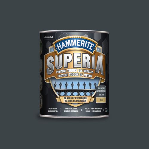 El metal se deteriora, especialmente en el exterior. Es particularmente vulnerable a la oxidación y precisa de productos específicos para protegerlo de manera duradera. Con Hammerite Superia Mate Gris Oscuro 750 mL es la nueva generación en esmalte antioxidante al agua, formulado para aplicarse directo al óxido y sobre cualquier metal sin imprimación. Tiene una protección avanzada contra la corrosión de hasta 12 años en condiciones climáticas adversas y frente a la radiación UV. Con “colour lock technology”: mate y color inalterable. Alta resistencia a golpes y ralladuras. Gracias a su acabado mate, da un aspecto liso mate a barandillas, rejas, verjas y todos los objetos de cualquier tipo de metal principalmente en exterior y expuestos a la intemperie y al sol. Excelente adherencia sobre hierro, hierro oxidado, acero, metal galvanizado, aluminio. Útiles de aplicación brocha, rodillo o pistola. Fácil aplicación en todos los metales, secado rápido, dos capas en un día. Tiempo de repintado 4 horas sin ningún límite, con pistola 1 hora entre capa y capa. Rendimiento de 7,5 m²/L por capa. El producto es base agua y ayuda a proteger el medio ambiente, además de brindar una fácil limpieza de útiles con agua y jabón. Listo para su uso. Disponibles en blanco, negro, gris, gris oscuro, marrón oscuro, rojo carruajes. No es recomendarle mezclar colores.