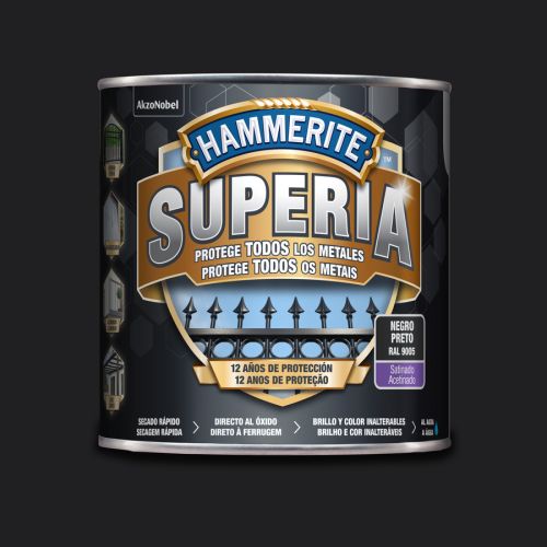 El metal se deteriora, especialmente en el exterior. Es particularmente vulnerable a la oxidación y precisa de productos específicos para protegerlo de manera duradera. Con Hammerite Superia Satinado Negro 2,5 L es la nueva generación en esmalte antioxidante al agua, formulado para aplicarse directo al óxido y sobre cualquier metal sin imprimación. Tiene una protección avanzada contra la corrosión de hasta 12 años en condiciones climáticas adversas y frente a la radiación UV. Con “colour lock technology”: acabado y color inalterable. Alta resistencia a golpes y ralladuras. Gracias a su acabado satinado, da un aspecto liso satinado a barandillas, rejas, verjas y todos los objetos de cualquier tipo de metal principalmente en exterior y expuestos a la intemperie y al sol. Excelente adherencia sobre hierro, hierro oxidado, acero, metal galvanizado, aluminio. Útiles de aplicación brocha, rodillo o pistola. Fácil aplicación en todos los metales, secado rápido, dos capas en un día. Tiempo de repintado 4 horas sin ningún límite, con pistola 1 hora entre capa y capa. Rendimiento de 7,5 m²/L por capa. El producto es base agua y ayuda a proteger el medio ambiente, además de brindar una fácil limpieza de útiles con agua y jabón. Listo para su uso. Disponibles en blanco, negro, gris, gris oscuro, marrón oscuro, rojo carruajes, verde. No es recomendarle mezclar colores.